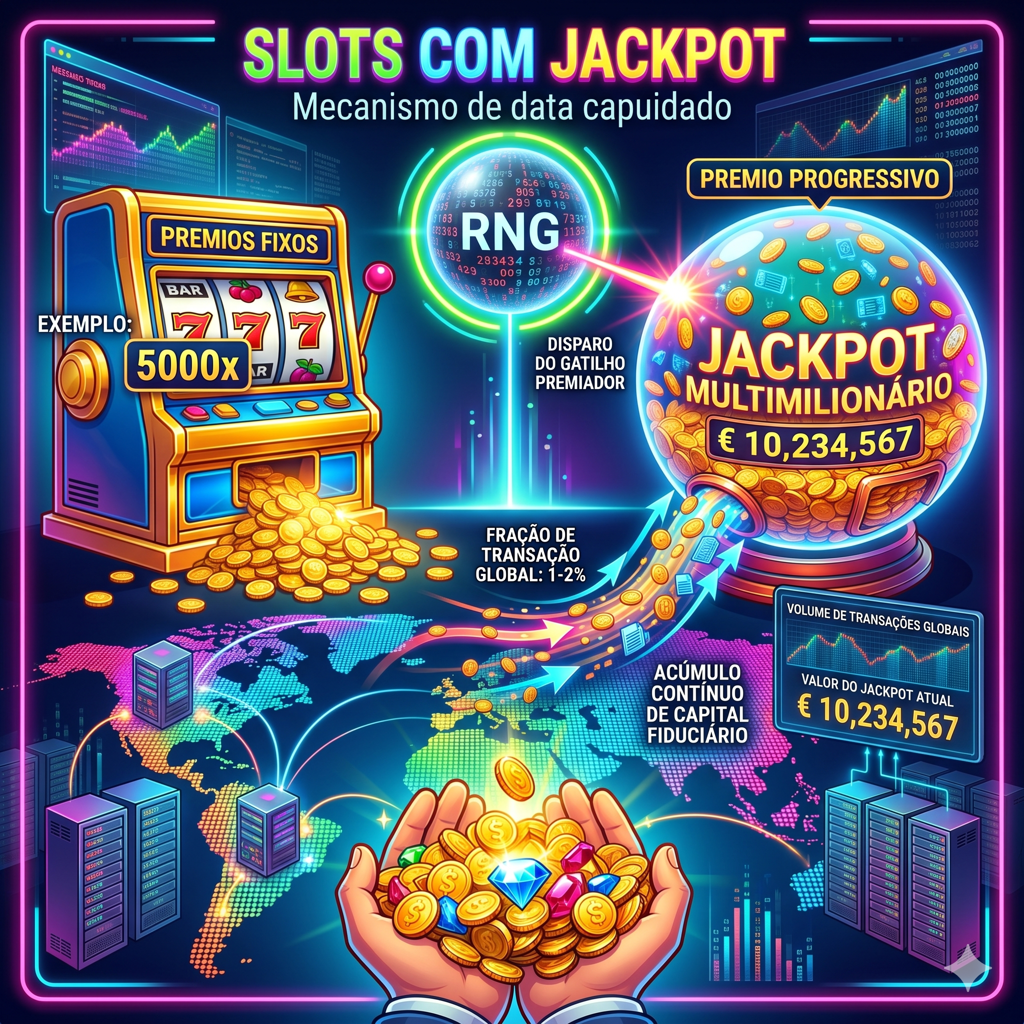 O desenvolvimento de máquinas atreladas a potes de premiação introduz o conceito de liquidez compartilhada. A estruturação divide-se em prêmios fixos, originados de multiplicadores rígidos aplicados sobre o valor da aposta nominal (exemplo: 5000x o risco inicial), e prêmios progressivos. A mecânica progressiva retém uma fração microscópica (frequentemente entre 1% e 2%) de cada transação financeira executada em toda a rede global de servidores que hospedam o jogo. O acúmulo contínuo deste capital fiduciário gera potes multimilionários. O disparo do gatilho premiador obedece a um algoritmo gerador de números aleatórios independente, conferindo a possibilidade matemática de extração de montantes transformadores a partir da execução de apostas mínimas.