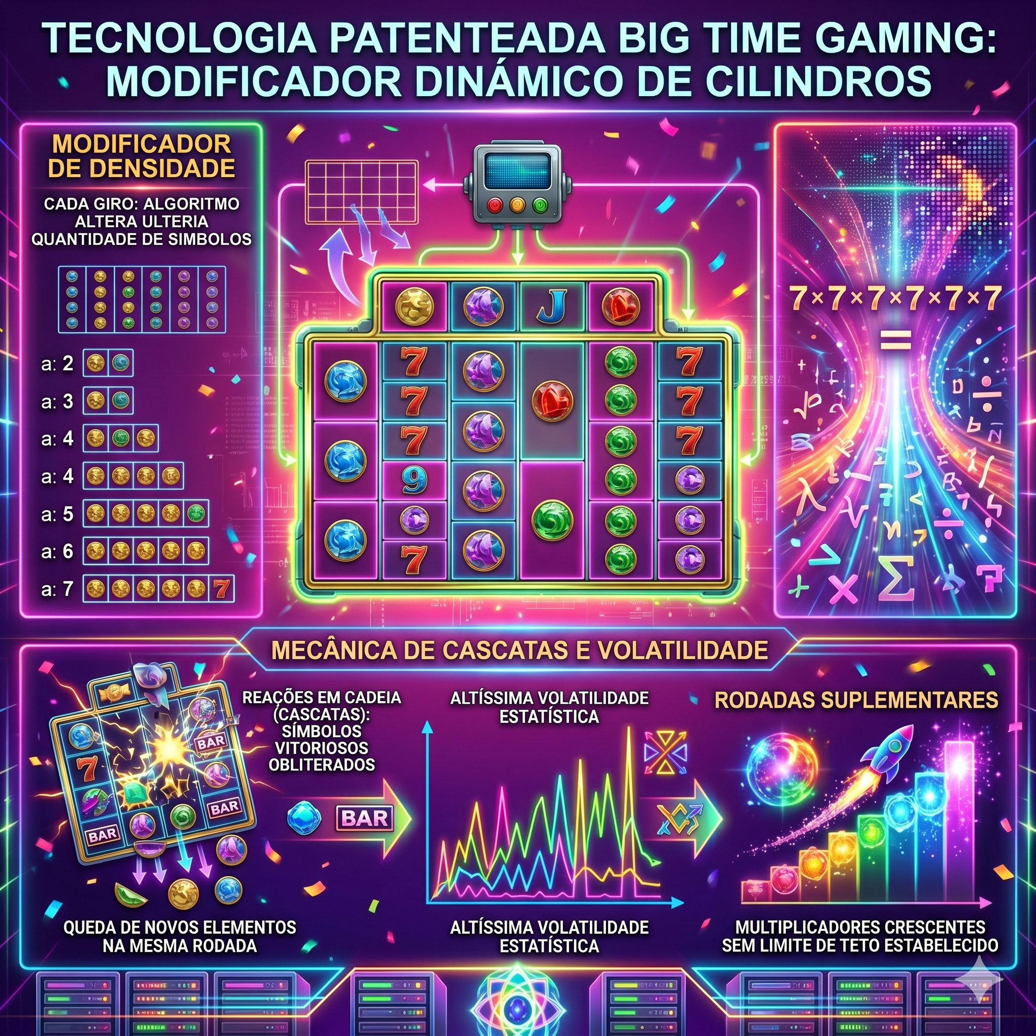 A engenharia matemática patenteada pela desenvolvedora Big Time Gaming reconfigurou o padrão de combinações da indústria cibernética. A restrição de linhas estáticas cede lugar a um modificador dinâmico de cilindros. A cada execução do botão de giro, o algoritmo altera a quantidade de símbolos exibidos em cada uma das 6 bobinas principais, variando a densidade de 2 a 7 elementos por coluna. O preenchimento máximo da matriz geométrica resulta na geração instantânea de 117.649 maneiras possíveis de intersecção vitoriosa. A arquitetura atrela-se invariavelmente a índices de altíssima volatilidade estatística, operando através de reações em cadeia (cascatas) e multiplicadores crescentes sem limite de teto estabelecido durante as rodadas suplementares.