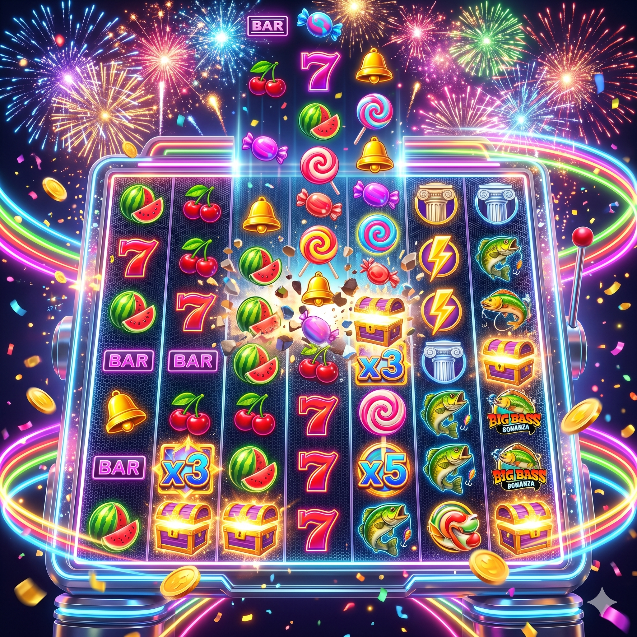 A engenharia de software elaborada pela Pragmatic Play descarta o conceito ortodoxo de linhas de pagamento. A grade de exibição compreende 6 bobinas verticais e 5 linhas horizontais. A liberação de ganhos fiduciários ocorre mediante o sistema Scatter Pays, exigindo o aparecimento simultâneo de um mínimo de 8 símbolos idênticos em qualquer coordenada da matriz geométrica. A constatação estatística aponta um Retorno Teórico (RTP) na faixa de 96,48%. O pico de atração financeira reside na fase de giros suplementares, onde a injeção de algoritmos em formato de bombas coloridas aplica multiplicadores aleatórios que variam de 2x a 100x sobre a vitória da cascata mecânica, permitindo faturamentos nominais de até 21.100 vezes o risco inicial.